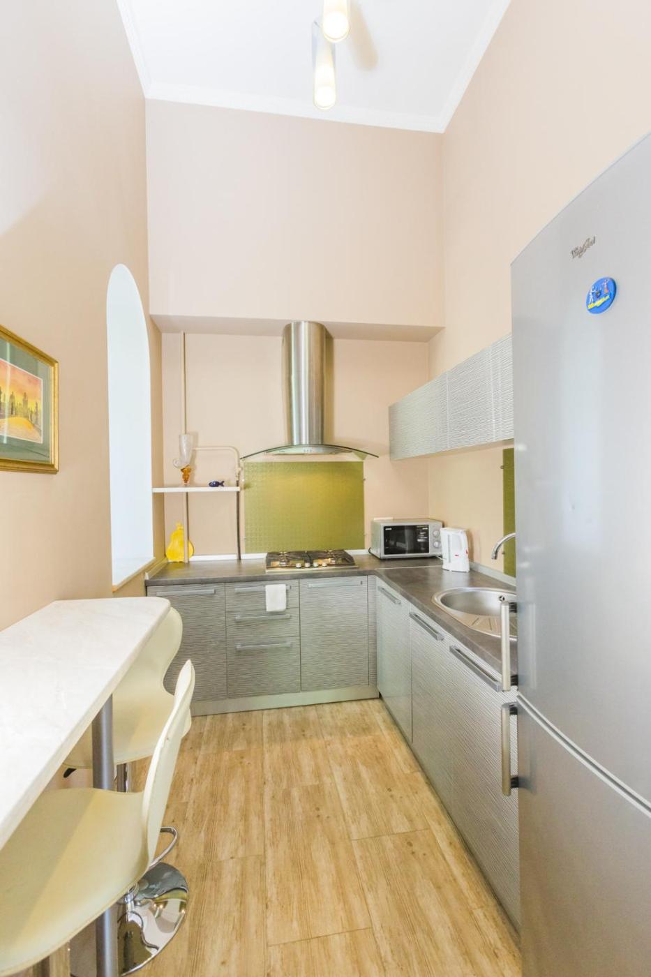 One-Bedroom Apartment - Mykhaylivska 22a. This air-conditioned apartment features a fully equipped kitchen and a sofa. It is located at Mykhailovska Street 22a.