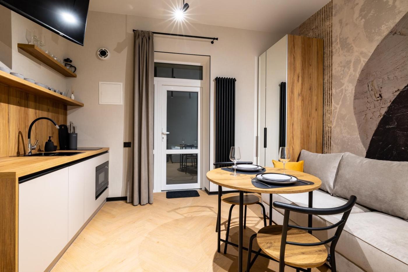 One-Bedroom Apartment. Boasting a private entrance, this apartment features a kitchenette, 1 bedroom and 1 bathroom with a shower and a hairdryer. Meals can be prepared in the well-fitted kitchenette, which has a stovetop, a refrigerator, kitchenware and a microwave. The apartment features a flat-screen TV, a wardrobe, an electric kettle, a sofa as well as ancourtyard view. The unit has 2 beds.